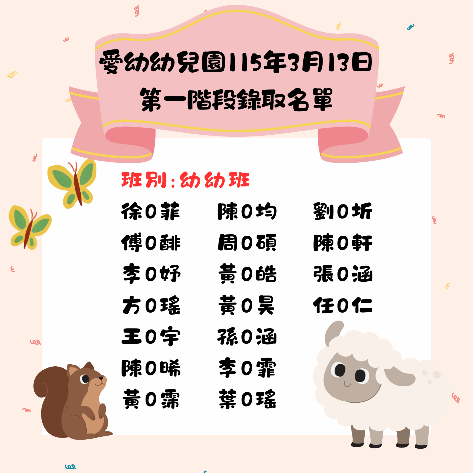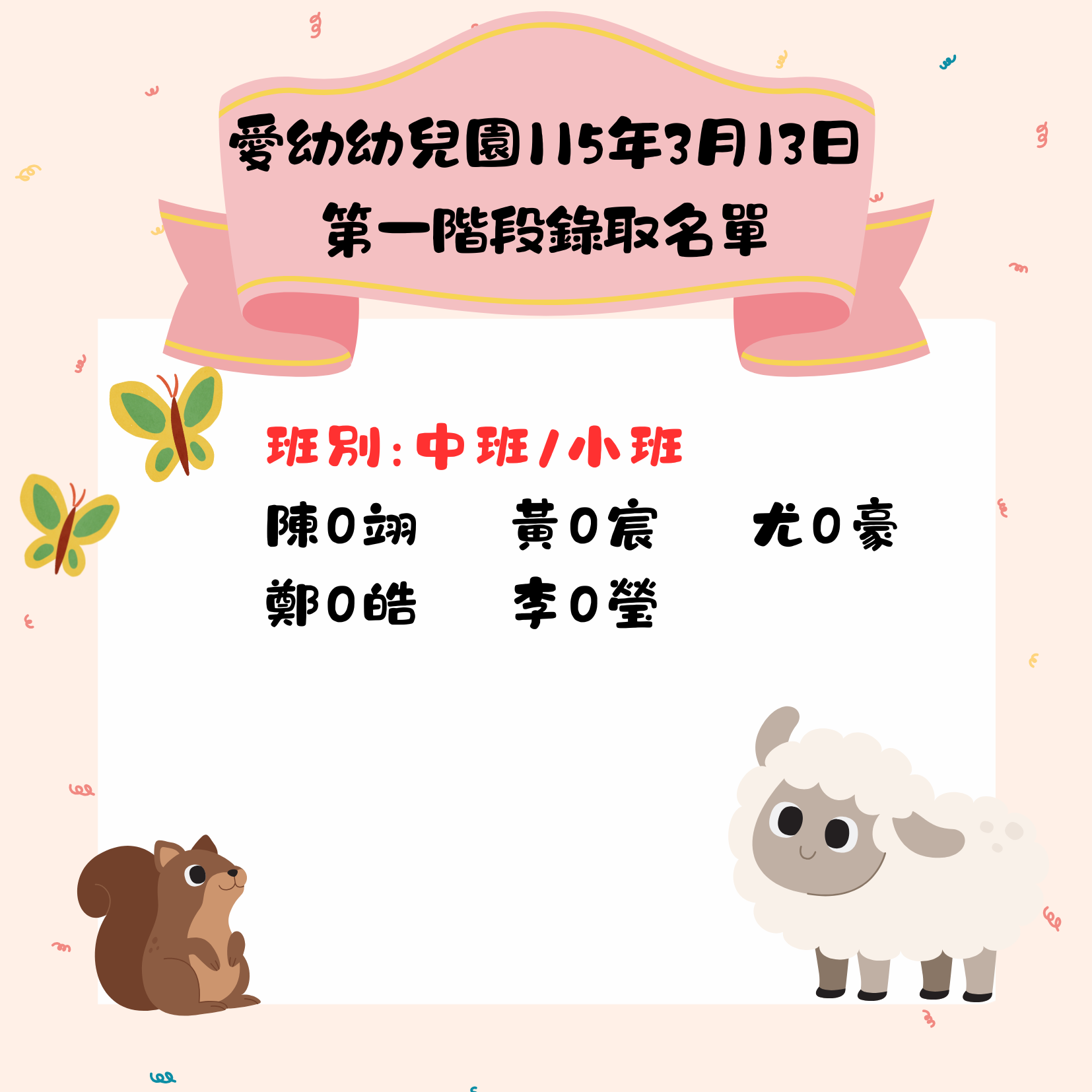 115學年度愛幼幼兒園第一階段入學錄取名單
